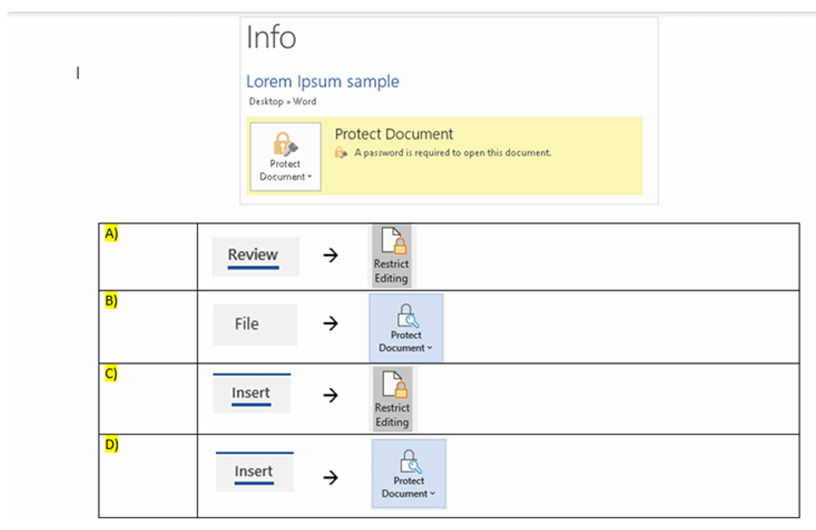Q16. You have a document which is placed on a shared drive. You only allow users with password access to retrieve and edit the file. How do you set file password for your file?