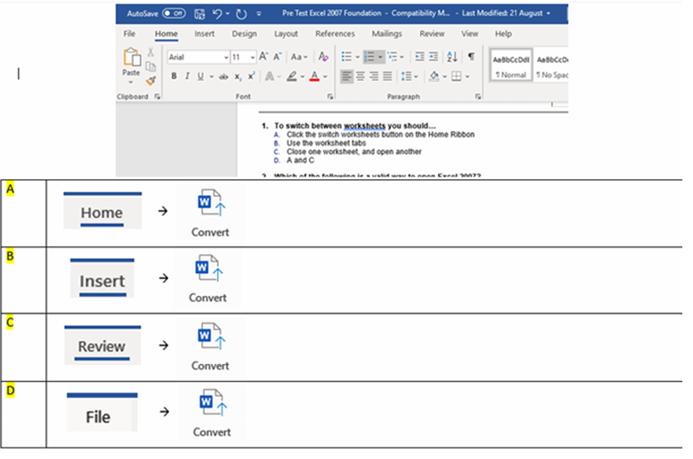 Q22. On the title bar of your current document shows [Compatibility Mode]. This tells you that you document is not saved in the latest format/version. How do ensure your document format is saved on the latest version?