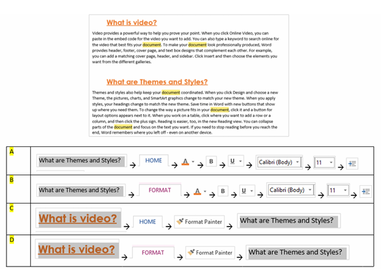 Q7. You would like the formatting of “”What is video?”” to be applied to the second title “”What are Themes and Styles?”” Which is the best method to achieve it?